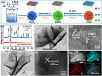 | Fig. 3. (a) Preparation process diagram of Cl-Bi catalyst. (b) XRD patterns of the Bi and Cl-Bi. TEM images of (c) Bi and (e) Cl-Bi. HRTEM images of (d) Bi and (f) Cl-Bi. (g) HAADF-STEM and elemental mappings of Bi (blue) and Cl (red) elements in Cl-Bi catalyst. | |