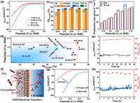 | Fig. 5. (a) LSV curves in 0.5 mol/L NaHCO3 electrolyte for Bi and Cl-Bi. (b) FEs of H2, CO and formate for Bi and Cl-Bi at different potentials. (c) Formate production rate of Bi and Cl-Bi. (d) The comparison of Cl-Bi in CO2RR performances formate-producing catalysts with other reported catalysts using typical H-type cell. (e) Long-term stability and FEHCOOH of Cl-Bi during 35 h. (f) Schematic illustration of flow cell. (g) LSV of Cl-Bi in flow/H-type cell. (h) Operational stability and FEHCOOH of Cl-Bi for 7 h at −0.9 V vs. RHE. | |