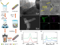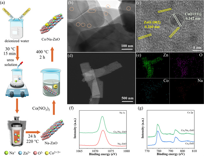 | Fig. 1. (a) Schematic diagram of Co5/Na1-ZnO sample preparation process. (b) TEM image, (c) HRTEM image, (d) HAADF-STEM images and (e) The corresponding EDX elemental mapping images of Co5/Na1-ZnO. (f) Na 1s XPS spectra and (g) Co 2p XPS spectra of Na1-ZnO, Co5/ZnO and Co5/Na1-ZnO. | |