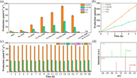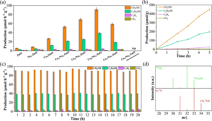| Fig. 2. (a) Photocatalytic activity of CH4 conversion over different samples. (b) Time-dependent photocatalytic activity over Co5/Na1-ZnO under light. (c) Production yields in the cyclic tests of Co5/Na1-ZnO. (d) GC–MS spectra of CH318OH and 13CH3OH produced over Co5/Na1-ZnO using an equivalent amount of H218O and 13CH4 as the reactant. | |