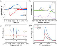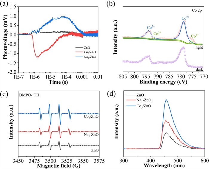 | Fig. 3. (a) TR-SPV responses of ZnO, Na1-ZnO and Co5/ZnO. (b) In situ NAP-XPS spectra of Co 2p over Co5/ZnO under light irradiation. (c) EPR spectra and (d) fluorescence spectra related to the amounts of hydroxyl radical formed after irradiation for 1 h of ZnO, Na1-ZnO and Co5/ZnO. | |