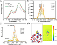 | Fig. 4. (a) CH4-TPD spectra of Na1-ZnO. (b) In-situ DRIFTS spectra at room temperature with CH4 adsorption in dark for different time Na1-ZnO. (c) C 1s near ambient pressure XPS spectra over Na1-ZnO in Ar purging and upon exposure to 0.45 mbar of CH4 in dark. (d) Different dimensional plots of electron density differences for CH4 adsorbed on Na1-ZnO. | |