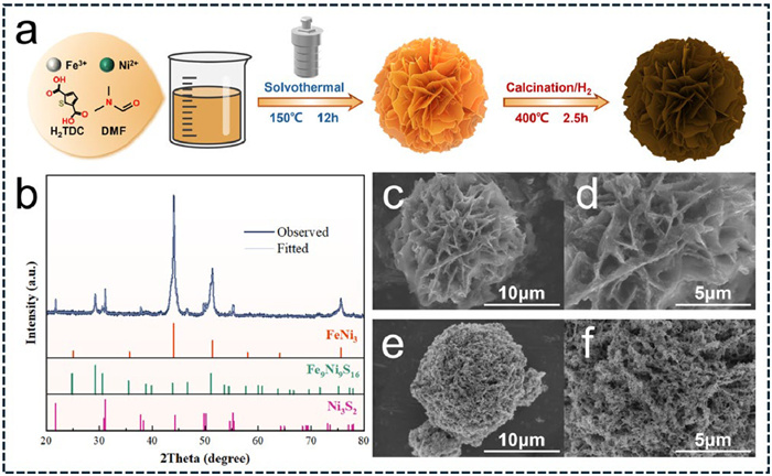 The NiFe-MOF was synthesized via a self-assembly process under 120 ℃ for 12 h. The FeNi3-S materials were then fabricated by calcinating NiFe-MOF at 400 ℃ for 2.5 h under the H2 atmosphere. Fig. 1a shows the schematic diagram for the synthesis of the NiFe-MOF and FeNi3-S materials.