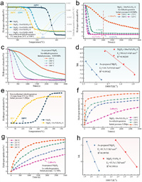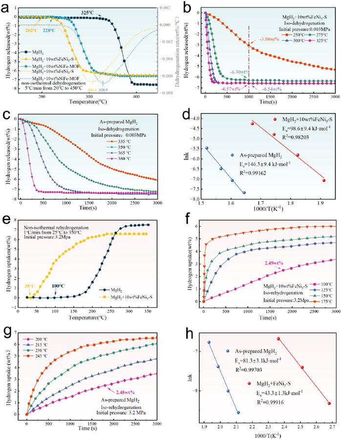| Fig. 2. (a) Non-isothermal dehydrogenation curves of MgH2 + 10 wt% (NiFe-MOF/FeNi3-S) composites and the corresponding differential curves. (b) Isothermal dehydrogenation curves of MgH2 + 10 wt% FeNi3-S composites at 250, 275, 300 and 325 ℃. (c) Isothermal dehydrogenation curves of MgH2 at 335, 350, 365 and 380 ℃. (d) Fitted Arrhenius curves of MgH2 and MgH2 + 10 wt% FeNi3-S composites. (e) Non-isothermal hydrogenation curves of MgH2 + 10 wt% (NiFe-MOF/FeNi3-S) composites. (f) Isothermal hydrogenation curves of MgH2 + 10 wt% FeNi3-S composites at 100, 125, 150 and 175 ℃. (g) Isothermal hydrogenation curves of MgH2 at 200, 215, 230 and 245 ℃. (h) Fitted Arrhenius curves of MgH2 and MgH2 + 10 wt% FeNi3-S composites. | |