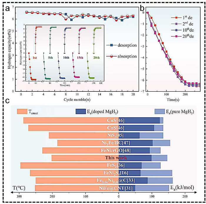 | Fig. 3. (a) Dehydrogenation and rehydrogenation cycles of MgH2 + 10 wt% FeNi3-S composites at 300 ℃ (the inset figure is representative dehydrogenation and rehydrogenation cycles). (b) Comparisons of different dehydrogenation curves during the 20 cycles. (c) Current studies on FeNi alloy and FeNi sulfide catalysts for MgH2 [16,31,33,36,45–48]. | |