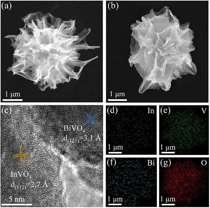 | Fig. 1. SEM images of (a) InVO4 and (b) InVO4/BiVO4. (c) HRTEM image of InVO4/BiVO4. (d − g) EDS elemental mapping images (In, V, Bi and O) of InVO4/BiVO4. | |