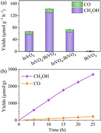 | Fig. 3. (a) Yields of products with different photocatalysts. (b) Time-on-line amounts of products by InVO4/BiVO4. | |