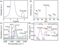 | Fig. 4. (a) 1H NMR spectrum of the products produced from 13CO2 reduction. (b) MS analyses for solar-driven reaction of H218O to 18O2 (m/z = 36) using InVO4/BiVO4 as photocatalyst. (c) IS-IR spectra of the CO2 photoreduction reaction with InVO4/BiVO4 as photocatalyst. (d) Calculated free-energy plots for CO2 photoreduction of InVO4, and InVO4/BiVO4. | |