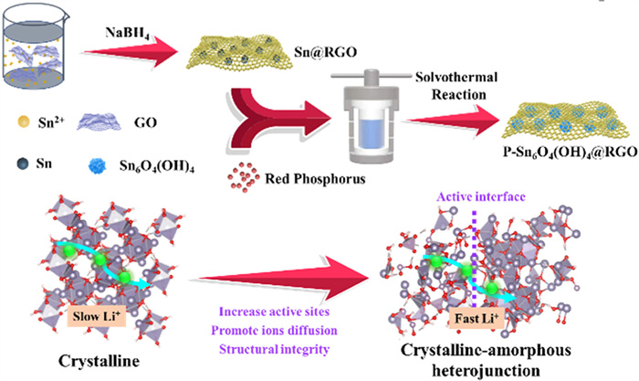 Herein, a phosphorus-modified graphene encapsulated Sn6O4(OH)4 nanoparticles composite (P-Sn6O4(OH)4@RGO) was successfully designed and prepared through a simple reduction method combined with solvothermal phosphating. The solvothermal phosphating modification treatment enables the uniform distribution of Sn6O4(OH)4 nanoparticles and encapsulated by graphene. This structure effectively enhances the structural stability of the electrode, while avoiding direct contact with the electrolyte and preventing the further growth of solid electrolyte interface (SEI). Phosphorus modification treatment enables the electrode material to have a crystalline-amorphous heterostructure, which enhances the stability of the electrode material while accelerating ion transport. Thus, the obtained P-Sn6O4(OH)4@RGO composite possesses excellent high-rate and long-term cycle performance (maintained 970 mAh/g at 1.0 A/g after 1450 cycles), which provides guidance for the preparation of advanced electrode materials.