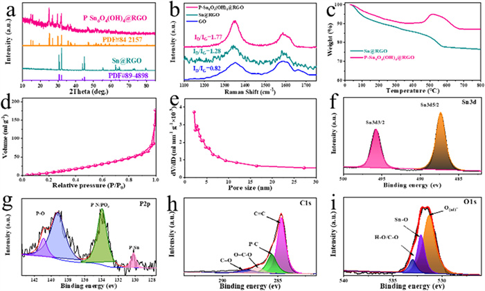 | Fig. 3. (a) XRD patterns, (b) Raman spectra and (c) TGA curves of Sn@RGO and P-Sn6O4(OH)4@RGO. (d) N2 adsorption-desorption curves and (e) corresponding pore size distribution of P-Sn6O4(OH)4@RGO. High-resolution XPS spectra of (f) Sn 3d, (g) P 2p, (h) C 1s and (i) O 1s for P-Sn6O4(OH)4@RGO. | |