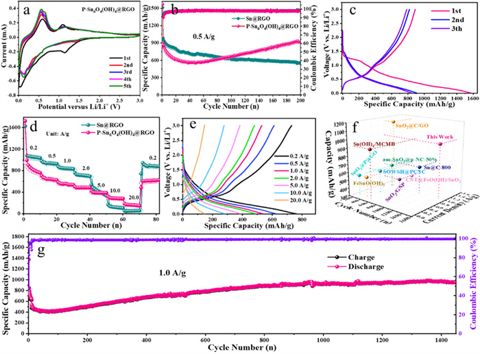 | Fig. 4. Electrochemical performance. (a) CV curves for the P-Sn6O4(OH)4@RGO electrode at 0.2 mV/s. (b) Cycling performance of the prepared electrodes at 0.5 A/g. (c) The first three curve charge-discharge of P-Sn6O4(OH)4@RGO at 0.5 A/g. (d) Rate capabilities of the two electrodes at various current densities between 0.2 A/g and 20.0 A/g and (e) corresponding charge-discharge profiles at various current densities of P-Sn6O4(OH)4@RGO. (f) Comparison of long-life cycle performance with other reported Sn-based anode materials. (g) Long-term cycling performance of P-Sn6O4(OH)4@RGO at 1.0 A/g. | |