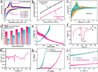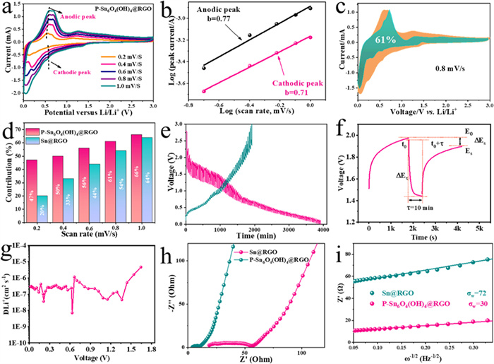 | Fig. 5. (a) CV curves of the P-Sn6O4(OH)4@RGO electrode at different scan rates from 0.2 mV/s to 1.0 mV/s. (b) Corresponding log(i) versus log(v) plots at different cathodic/anodic peaks. (c) CV curve with the pseudocapacitive fraction at 0.8 mV/s. (d) Pseudocapacitive contribution ratio at various scan rates for P-Sn6O4(OH)4@RGO. (e) GITT profile of P-Sn6O4(OH)4@RGO electrode, (f) demonstration of a single titration and (g) calculated Li-ion diffusion coefficient for P-Sn6O4(OH)4@RGO electrode from the GITT technique during discharge process. (h) EIS curves of Sn@RGO and P-Sn6O4(OH)4@RGO electrodes after cycling and (i) the corresponding Z’ plotted against ω−1/2 curves at low frequency. | |