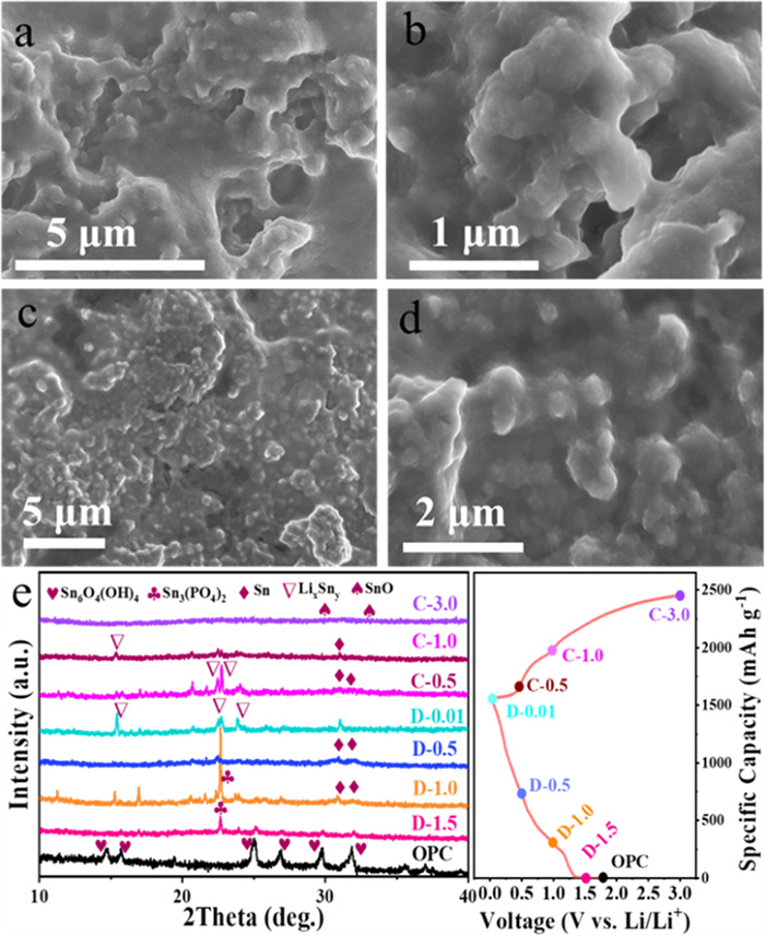 | Fig. 6. SEM images of (a, b) Sn@RGO and (c, d) P-Sn6O4(OH)4@RGO electrodes after cycling. (e) Ex-situ XRD patterns of P-Sn6O4(OH)4@RGO electrode at various states for the first cycle. | |