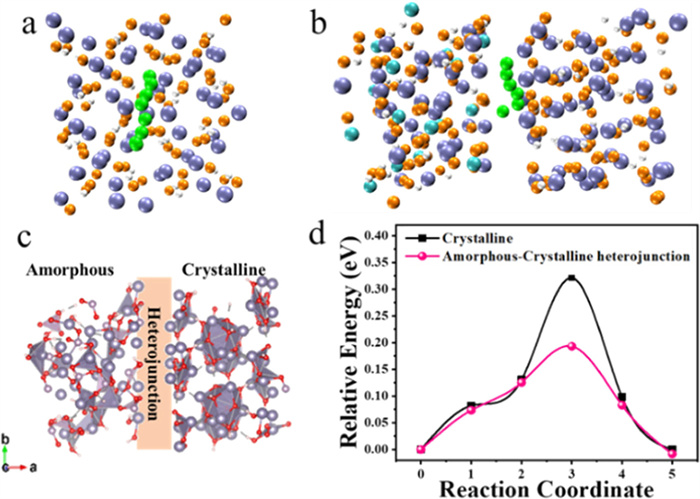 | Fig. 7. Schematic diagram of the structure of lithium ions diffusion along the path of minimum energy for (a) crystalline and (b) crystalline-amorphous heterojunction, respectively. (c) Top view of the optimized structure of electrode with amorphous-crystalline heterojunction. (d) Calculated Li-ion diffusion energy barriers for electrodes with crystalline and crystalline-amorphous heterojunction. H atoms, O atoms, Sn atoms, P atoms and Li+ ions are shown in white, orange, ice blue, cyan and green, respectively. | |