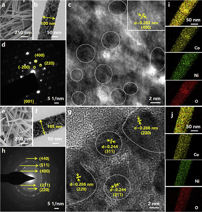 | Fig. 1. Structural characterizations of (a-d, i) the mesocrystalline and (e-h, j) polycrystalline NiCo2O4 nanorods. (a, e) SEM; (b, f) TEM; (c, g) HR-TEM; (d, h) SAED; (i, j) Elemental mapping images. | |