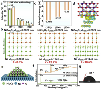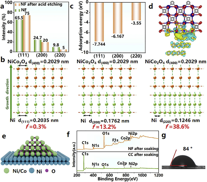 | Fig. 4. NF-driven epitaxial growth mechanism facilitates nucleation and growth. (a) Crystal facet ratio of NF and NF after acid etching. (b) The lattice mismatch of Ni (111), Ni (200) and Ni (220) to NiCo2O4 (400). (c) Adsorption energies of NiCo2O4 (400) on Ni (111), Ni (200) and Ni (220). (d) Charge density difference of NiCo2O4 (400) on Ni (111). (e) Schematic diagram of lattice matching-induced epitaxial growth. (f) XPS spectrum of NF after soaking and CC after soaking. (g) Static water contact-angle measurement of NF after acid etching. | |