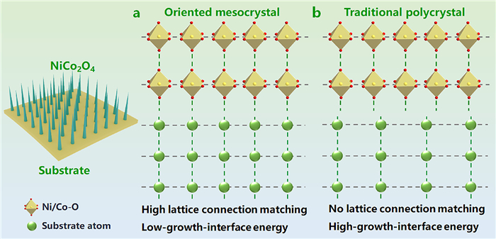 Previous studies have demonstrated that mesocrystalline NiCo2O4 with distinct morphologies can be synthesized on nickel foam (NF) substrates through hydrothermal temperature tuning. Their growth mechanism follow a topological transformation process controlled by edge-to-core corrosive etching [1]. Based on this, we innovatively proposed a grain orientation regulation strategy based on interfacial engineering between NF and carbon cloth (CC) substrates, successfully realizing controllable synthesis of NiCo2O4 mesocrystalline and polycrystalline nanorods. The orientationally assembled mesocrystalline structure significantly optimized Li+ transport kinetics through constructing interconnected grain boundary networks and a unique grain-boundary synergistic deformation mechanism, with a high delithiation specific capacity of 1892 mAh/g (0.1 A/g) and 85.7% capacity retention rate (2 A/g, 500 cycles). By combining substrate-crystal interface analysis and density functional theory (DFT) calculations, we have identified the regulatory mechanism of substrate-crystal interfacial interactions on nucleation kinetics and growth modes: Acid-etched NF substrate establishes an epitaxial interface with merely 0.3% lattice mismatch NiCo2O4 (400) and Ni (110) planes, effectively reducing the nucleation activation energy, thereby enabling oriented nucleation and growth at low temperatures (30–60 ℃). In contrast, the chemically inert CC substrates required a thermodynamic driving force at 120 ℃ to overcome surface diffusion barriers to form polycrystals. This study elucidates the nature of substrate-induced crystal orientation in hydrothermal synthesis. The established substrate-crystal interaction model not only deepens fundamental understanding of heterogeneous nucleation dynamics, but also provides a universal theoretical framework for lattice-matched design and mesostructure controlled synthesis of advanced energy materials.