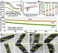 | Fig. 2. The Li+-storage properties of the NiCo2O4 nanorods. (a) Rate performance from 0.1 A/g to 5 A/g. (b) Cycle stability at 2 A/g. (c) Separation of capacitive (gray part) and diffusion (red line part) controlled contribution at 0.8 mV/s and (d) pseudocapacitive contribution ratio at a series of scan rates for the mesocrystalline nanorods. Ex-situ TEM images of (e-h) mesocrystalline and (i-l) polycrystalline NiCo2O4 nanorods at various lithiation voltages. | |