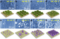 | Fig. 3. SEM images and corresponding schematic diagrams illustrating the structural evolution during the growth of (a-d) mesocrystalline and (e-h) polycrystalline NiCo2O4 nanorods. (a, e) 30 ℃-1 h; (b, f) 60 ℃-1 h; (c, g) 90 ℃-1 h; (d, h) 120 ℃-1 h. | |