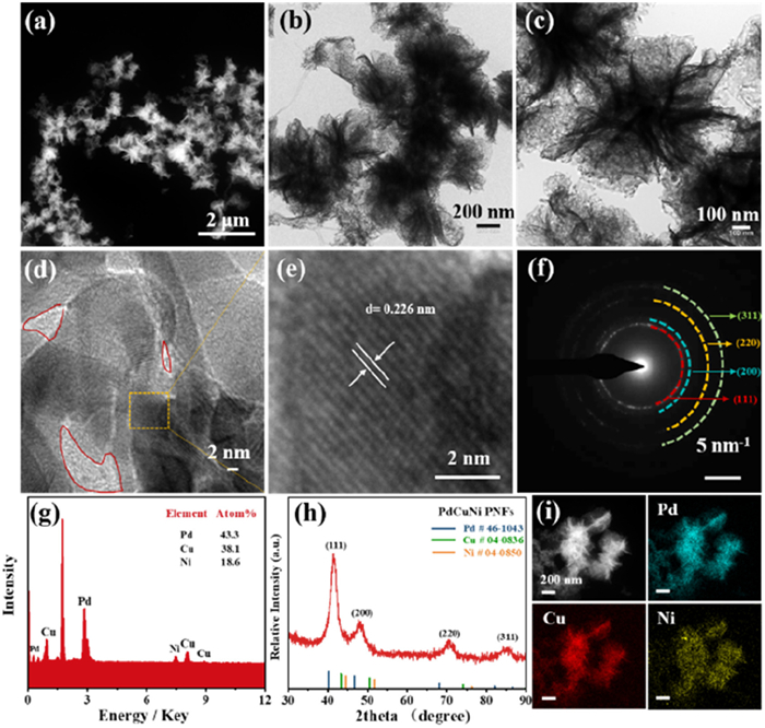 | Fig. 1. Typical (a) HAADF-STEM image, (b, c) TEM image, (d, e) HRTEM image, (f) SAED, (g) SEM-EDS spectrum, (h) XRD pattern and (i) elemental mapping analysis of the PdCuNi PNFs. | |