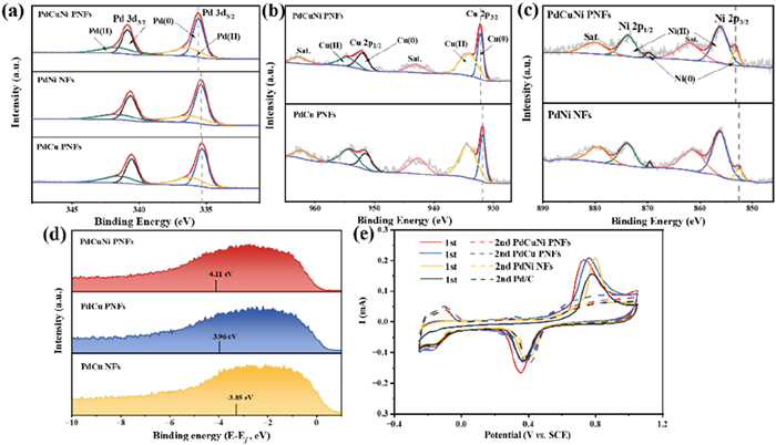 | Fig. 2. (a) XPS spectra of Pd 3d in PdCuNi PNFs, PdCu PNFs and PdNi NFs. (b) XPS spectra of Cu 2p in PdCuNi PNFs and PdCu PNFs. (c) XPS spectra of Ni 2p in PdCuNi PNFs and PdNi NFs. (d) The valence band spectra. (e) CO stripping voltammograms. | |