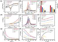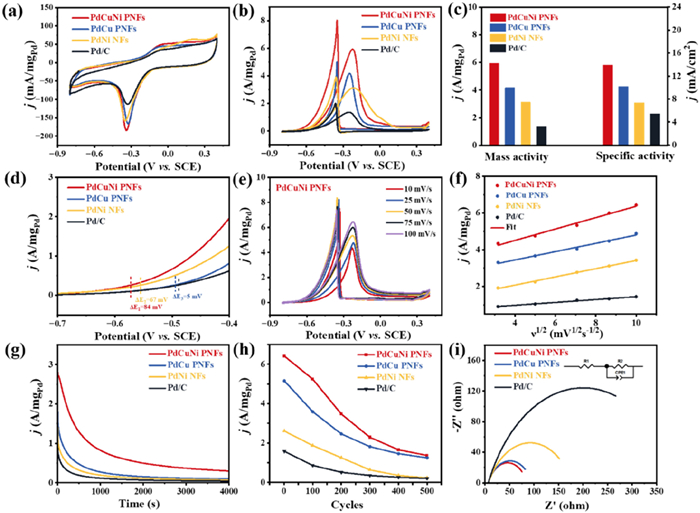 | Fig. 3. The EOR performances of PdCuNi PNFs, PdCu PNFs, PdNi NFs and commercial Pd/C. CV curves in (a) 1 mol/L KOH solution and (b) 1 mol/L KOH containing 1 mol/L ethanol electrolyte. (c) The histogram of mass activity and specific activity. (d) Onset potentials. (e) CV curves of PdCuNi PNFs at different scan rates. (f) The plot of mass activity vs. the square root of the scan rate. (g) CA curves at −0.24 V. (h) The variation of mass activity along with 500 cycles. (i) EIS spectra. | |