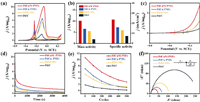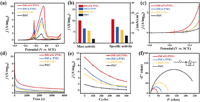 | Fig. 4. The EGOR performances of PdCuNi PNFs, PdCu PNFs, PdNi NFs and commercial Pd/C. (a) CV curves. (b) Summarized mass activity and specific activity. (c) Onset potentials. (d) CA curves at −0.13 V. (e) The long-term variation of activity with cycles. (f) EIS spectra. | |