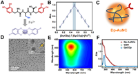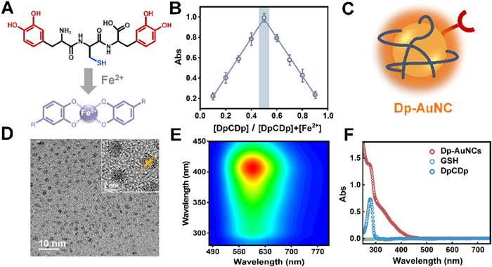 | Fig. 1. (A) Schema of chelation of DpCDp with Fe2+. (B) Job's plot indicating the binding ratio between DpCDp and Fe2+. (C) Schematic diagram of Dp-AuNC. (D) TEM image of Dp-AuNCs. Inset: high-resolution TEM image showing lattice fringes. (E) Three-dimensional fluorescence spectrum of Dp-AuNCs. (F) UV–vis absorption spectra of Dp-AuNCs, GSH (0.6 mmol/L) and DpCDp (0.16 mmol/L). | |