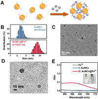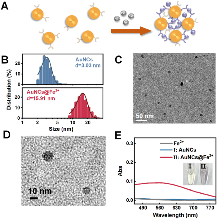 | Fig. 2. (A) Schematic illustration of Dp-AuNCs chelating Fe2+. (B) TEM-based particle size distributions demonstrating the size increase from Dp-AuNCs to Dp-AuNCs@Fe2+ upon Fe2+-mediated assembly. (C) TEM image of Dp-AuNCs@Fe2+ assemblies. (D) High-resolution TEM image of Dp-AuNCs@Fe2+ nanoassemblies. (E) UV–vis absorption spectra and photograph showing the color change of Dp-AuNCs before and after chelation with Fe2+ (25 µmol/L). | |