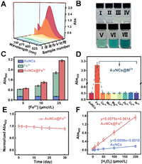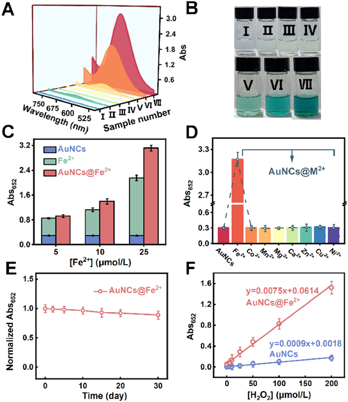| Fig. 3. (A) UV–vis absorption spectra of different reaction components. The concentrations of TMB, H2O2, Dp-AuNCs, Fe2+ and Dp-AuNCs@Fe2+are 3.0 mmol/L, 2.0 mmol/L, 98 µg/mL, 5.0 µmol/L and 100 µg/mL, respectively. (B) Photographs of the reaction mixtures under daylight (Ⅰ: TMB, Ⅱ: TMB + H2O2, Ⅲ: TMB + Dp-AuNCs, Ⅳ: TMB + Dp-AuNCs@Fe2+, Ⅴ: TMB + H2O2 + Dp-AuNCs, Ⅵ: TMB + H2O2 + Fe2+, Ⅶ: TMB + H2O2 + Dp-AuNCs@Fe2+). (C) Comparison of catalytic activities of Dp-AuNCs@Fe2+ at varying Fe2+ chelation concentrations, with those of Dp-AuNCs alone and Fe2+ alone at corresponding concentrations. (D) Catalytic activities of Dp-AuNCs coordinated with various metal ions, showing the highest activity for Fe2+-bound assemblies. (E) Catalytic stability of Dp-AuNCs@Fe2+ over a period of 0–30 days. (F) Calibration curves of Dp-AuNCs and Dp-AuNCs@Fe2+ for H2O2 detection in the range of 0–200 µmol/L. | |