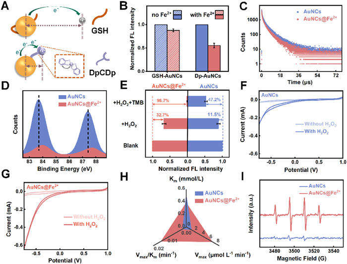| Fig. 4. (A) Schematic diagram of electron transfer process between DpCDp-enhanced Dp-AuNCs and Fe2+. (B) Fluorescence intensity at 600 nm of GSH-AuNCs and Dp-AuNCs mixed with Fe2+(25 µmol/L). (Ex = 404 nm). (C) Time-resolved fluorescence lifetime decay spectra of Dp-AuNCs after addition of Fe2+ (25 µmol/L). (D) XPS binding energy changes of Dp-AuNCs chelating Fe2+(25 µmol/L). (E) Fluorescence intensity changes of Dp-AuNCs and Dp-AuNCs@Fe2+ after treatment with H2O2 (2.0 mmol/L) and with a mixture of H2O2 (2.0 mmol/L) and TMB (3.0 mmol/L). (F, G) Cyclic voltammetry (CV) curves of (F) Dp-AuNCs and (G) Dp-AuNCs@Fe2+ in the presence and absence of H2O2. (H) Michaelis−Menten kinetic analysis of Dp-AuNCs and Dp-AuNCs@Fe2+ toward H2O2. (I) EPR spectroscopy for the detection of ·OH generated by Dp-AuNCs and Dp-AuNCs@Fe2+. | |
