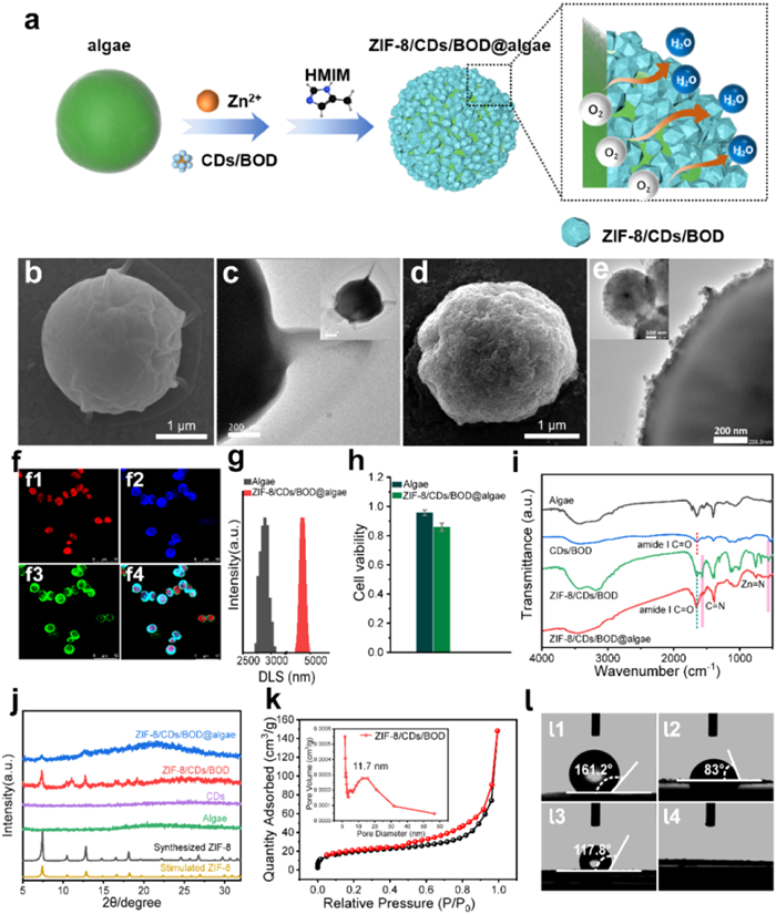 | Fig. 1. Fabrication and characteristics of ZIF-8/CDs/BOD@algae. (a) Schematic illustration showing the biomimetic mineralization of ZIF-8/CDs/BOD coated on the algal cell. (b) SEM and (c) TEM images of localized regions and whole cells (insets) of the native algal cells. Scale bar: 500 nm (Inset). (d) SEM and (e) TEM images of localized regions and whole cells (insets) of the ZIF-8/CDs/BOD@algae. Scale bar: 500 nm (Inset). (f) CLSM images of the ZIF-8/CDs/BOD@algae displayed in (f1) red, (f2) blue, (f3) green channels and (f4) overlay images. Red fluorescence, intracellular chlorophyll; blue, RhB labeled MOF shell; green, FITC labeled CDs/BOD hybrids. Scale bar: 10 µm. (g) DLS tests of native cells and ZIF-8/CDs/BOD@algae. (h) The cell viability measurement of native algal cells and ZIF-8/CDs/BOD coated cells. (i) FT-IR of native algae, CDs/BOD hybrids, ZIF-8/CDs/BOD and ZIF-8/CDs/BOD@algae. (j) XRD of stimulated ZIF-8, synthesized ZIF-8, native cells, CDs, ZIF-8/CDs/BOD and ZIF-8/CDs/BOD@algae. (k) The N2 sorption isotherms and pore width (Inset) of ZIF-8/CDs/BOD. (l) The water contact angles of (l1) ZIF-8, (l2) native algae, (l3) ZIF-8@algae and (l4) ZIF-8/CDs/BOD@algae. | |