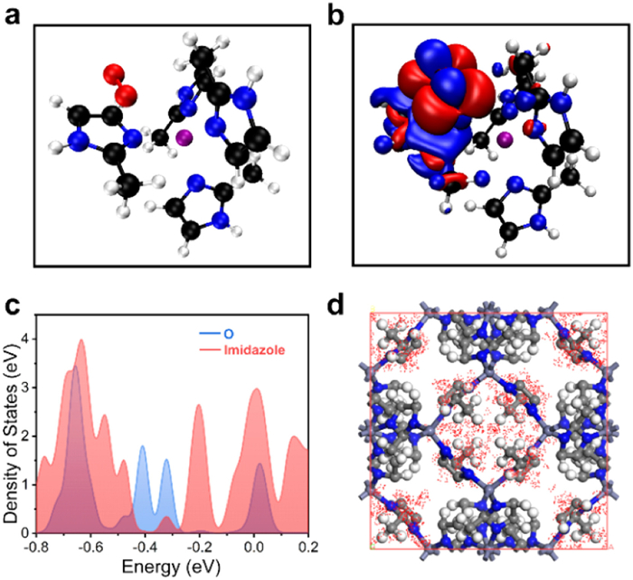 | Fig. 3. (a) The DFT calculations of optimized geometries of ZIF-8/O2. (b) Charge density differences for O2 adsorption. (c) DOS for O atoms adsorbed on imidazole of ZIF-8. (d) The COM probability density distributions for O2 adsorbed on imidazole of ZIF-8. | |