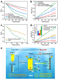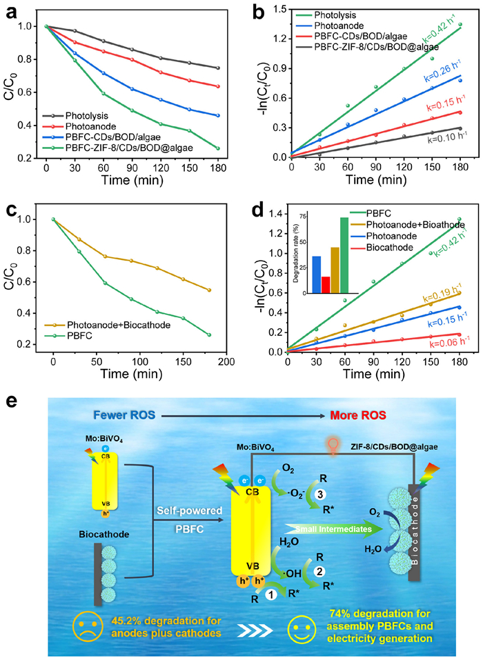 | Fig. 5. (a) TCH degradation in different systems and (b) the corresponding reaction kinetic plots. Experiments were conducted under short-circuit conditions in 0.1 mol/L PBS solution (pH 7) with 10 mg/L of TCH. (c) The remove efficiency of TCH by the PBFC-ZIF-8/CDs/BOD@algae under the open-circuit conditions (Photoanode+Biocathode) or short-circuit conditions. (d) The reaction kinetic plots of different components for TCH degradation. Inset, the corresponding degradation rate. (e) The schematic illustration of the PBFC to remove organic pollutants. | |