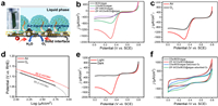 | Fig. 2. (a) The illustration of ZIF-8/CDs/BOD@algae biocathode for in-situ O2 supply at the triphasic interface and the corresponding photograph (Inset). (b) LSV curves of different electrodes. (c) LSV curves of ZIF-8/CDs/BOD@algae in O2 saturated solutions under dark conditions (black) and in air atmosphere under light conditions (red), scan rate: 10 mV/s. (d) The corresponding Tafel plots. (e) LSV curves of the ZIF-8/CDs/BOD@algae electrode under the light illumination (red) and dark conditions (black). (f) CVs of ZIF-8/CDs/BOD@algae and CDs/BOD/algae electrodes in 0.1 mol/L O2-free PBS solutions (pH 7.0), scan rate: 10 mV/s. | |