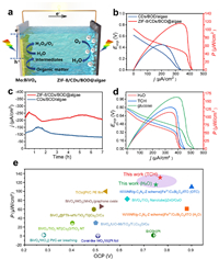 | Fig. 4. (a) The schematic illustration of PBFC based on ZIF-8/CDs/BOD@algae biocathodes. (b) Polarization curves (J-V) and power density (J-P) curves of the PBFC and (c) the long-term operational stability in PBS solutions (pH 7.0). (d) J-V and J-P curves of ZIF-8/CDs/BOD@algae based PBFC in different fuels. (e) Comparison of the performance metrics of PBFC based on Mo: BiVO4 photoanodes and ZIF-8/CDs/BOD@algae biocathodes with other PFCs. | |