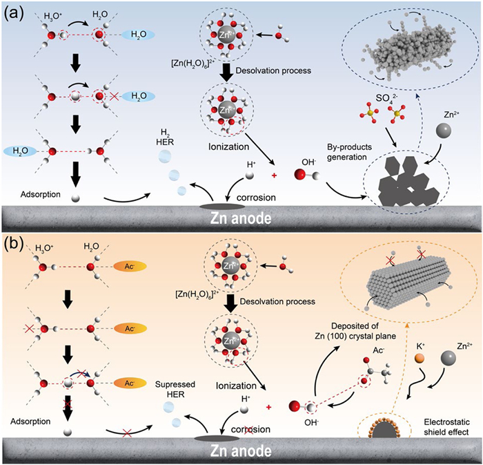 | Fig. 1. (a) Illustration of the different stages of H2O-induced side reactions occurring in the mild acid electrolyte. (b) Illustration of the CH3COOK-led synergistic modulation of hydrogen bond network reconstruction and electrostatic shield strategy. | |