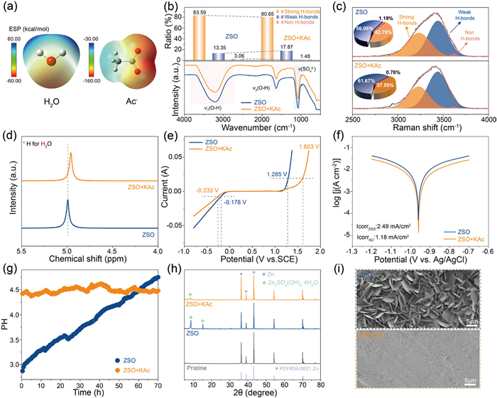 | Fig. 2. Hydrogen bond network reconstruction of ZSO + KAc electrolyte. (a) Electrostatic potential distribution of H2O and Ac−. The colors of the atomic model correspond as follows: White: H; red: O; gray: C. (b) FTIR spectra and proportion evolution of strong H-bonds, weak H-bonds and none H-bonds in ZSO and ZSO + KAc electrolytes. (c) Fitted Raman spectra between 2500 cm−1 and 4000 cm−1. (d) 1H NMR of ZSO and ZSO + KAc electrolytes. (e) LSV curves of ZSO and ZSO + KAc electrolytes. (f) Tafel curves of Zn anode and (g) operando pH monitoring within Zn||Zn symmetric cells upon cycling at 5 mA/cm2 of ZSO and ZSO + KAc electrolytes. (h) XRD patterns and (i) SEM images of Zn anodes soaked in ZSO and ZSO + KAc electrolytes for 7 days. | |