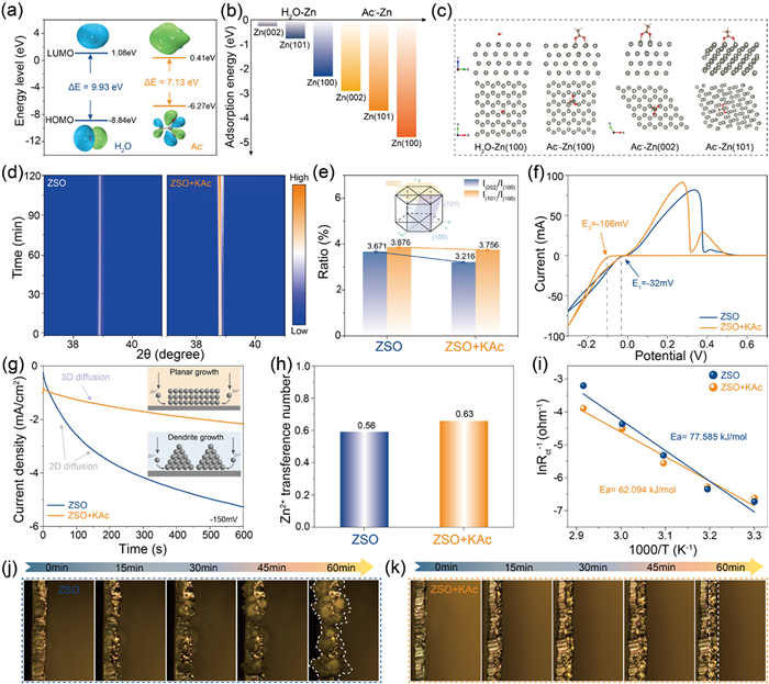 | Fig. 3. Insights into Zn-oriented dense deposition behavior. (a) LUMO and HOMO energy levels of H2O molecule and Ac− molecule. (b, c) Comparison of adsorption energies of Ac− molecules and H2O on different Zn crystalline planes. (d) Operando XRD at 1 mA/cm2. (e) Intensity ratios of different crystalline planes of cycled Zn metal from Zn||Zn symmetric cells, insert compared the nucleation overpotential of Zn2+. (f) CV curves recorded at 0.1 mV/s. (g) CA curves of Zn anode at a fixed overpotential of −150 mV, insets showing the Zn2+ diffusion mode. (h) Zn2+ migration number of ZSO and ZSO + KAc electrolytes. (i) The de-solvation activation energies of Zn anode calculated by the Arrhenius equation and (j, k) operando optical microscopy images of Zn plating process in ZSO and KAc electrolyte. | |