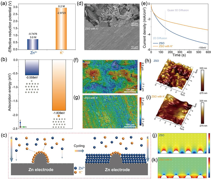 | Fig. 4. The electrostatic shielding effect of K+ cations (a) The effective reduction potentials of 3.0 mol/L Zn2+ and 0.2 mol/L K+. (b) The adsorption energies of Zn2+ and K+ on Zn metal. (c) Schematic illustration of working mechanism of the K+. (d) SEM images of Zn||Zn symmetric cells after 30 cycles and (e) the CA curves of Zn anode at a fixed overpotential of −150 mV with/without K+. The LSCM micrographs and the corresponding 3D reconstruction images after 10 cycles in the (f) ZSO and (g) ZSO with K+ electrolytes. AFM images of Zn||Zn symmetric cells after 50 cycles in (h) ZSO and (i) ZSO with K+. The COMSOL simulation results of Zn anode and the relative intensity distributions of the localized electric field in (j) ZSO and (k) ZSO with K+. | |