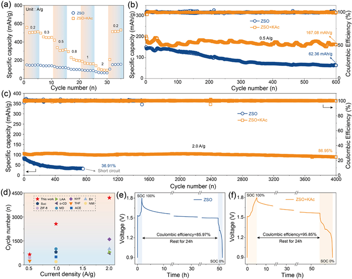 | Fig. 6. Electrochemical performance of Zn||MnO2 full battery in different electrolytes. (a) Rate performance of Zn||MnO2 full batteries in ZSO and ZSO + KAc electrolytes. Cycling performance at (b) 0.5 A/g and (c) 2.0 A/g. (d) Comparison of cycling performance with those reported works. Self-discharge curves of Zn||MnO2 full batteries in (e) ZSO and (f) ZSO + KAc electrolytes. | |