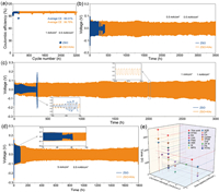 The influence of ZSO and ZSO+KAc electrolytes on the reversibility of Zn anode plating/stripping was assessed through an assessment of the Coulombic efficiency (CE) in Zn||Cu asymmetric cells, respectively. Fig. 5a presents the CE of Zn||Cu asymmetric cells at 1.0 mA/cm2 and 0.5 mAh/cm2, the ZSO+KAc achieves an outstanding average efficiency of 99.75%, which is higher than that of pure ZSO of 99.01%. Moreover, as shown in Fig. S12 (Supporting information), when cycling with the ZSO electrolyte, the passivation phenomenon became increasingly severe due to zinc dendrite formation and by-product passivation, leading to a decreasing trend followed by gradual increase and subsequent decrease in interface impedance. In contrast, the interface impedance did progressively diminish and remained stable with the addition of KAc. These results validate that KAc enhances the reversibility of Zn plating/stripping processes. To evaluate the long-term cycling life of Zn anodes in ZSO + KAc electrolytes, Zn||Zn symmetrical cells were assembled. The Zn||Zn symmetrical cell with ZSO electrolyte experienced a short circuit within a mere 259 h of cycling. In contrast, the Zn||Zn symmetric cells employing ZSO + KAc electrolytes exhibited long cycling lifespans lasting for 3500 h (Fig. 5b). Moreover, the cell with ZSO+KAc electrolyte at 1.0 mA/cm2 and 1.0 mAh/cm2 demonstrates the most extended lifespan of 3000 h, which is 9.3 times that of the cell with pure ZSO (320 h) in Fig. 5c. Furthermore, cycle life tests were conducted at 5 mA/cm2 and 0.5 mAh/cm2 (Fig. 5d), the cell utilizing ZSO+KAc electrolyte demonstrated an impressive lifespan of 1800 h. Conversely, the cell employing ZSO electrolyte failed within < 83 h. To demonstrate the superiority of KAc additive, this study compares it to other electrolyte additives for cycling performance AZIBs in Fig. 5e and Table S1 (Supporting information). Remarkably, the lifetime of Zn||Zn symmetric cells in this investigation exhibits significant competitiveness across all tested conditions.