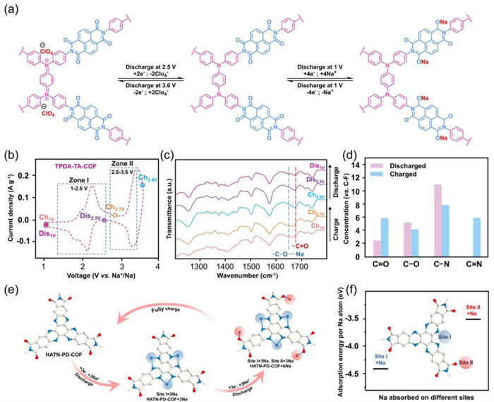 | Fig. 10. Redox mechanism and characterization during the charging-discharging process of TPDA-NDI-COF and HATN-PD-COF. (a) Mechanism investigation of TPDA-NDI-COF in NaClO4. (b) CV of charge and discharge profile and (c) ex-situ FT-IR spectra. (d) The concentration of bond intensities during the charging and discharging process. Reproduced with permission [101]. Copyright 2024, Wiley-VCH. (e) Structural evolution during the sodiation/desodiation process. (f) The adsorption energy per Na+ ion of HATN-PD-COF. Reproduced with permission [20]. Copyright 2024, Springer Nature. | |
