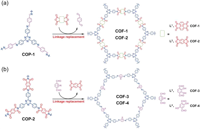 Considering the PI bonds are less reversible than COPs based on dynamic covalent bonds, Zeng et al. reported an easy preparation approach of PI-COFs from amorphous COPs through the linkage replacement under different reactions (Fig. 7) [63]. They first synthesized imine-linked COP-1 and amide-linked COP-2, and extended the ligand exchange strategy by introducing an anhydride to convert the imine-linkage COP-1 into amide-linked COF-1 and COF-2, and an aromatic aldehyde to convert the amide-linked COP-2 into imine-linked COF-3 and COF-4, respectively. The COFs with high crystallinity and porosity were fabricated successfully. Then, Lostch et al. synthesized Py-imide-COF from the precursor PyTTA with a ligand exchange approach. Firstly, the precursor PyTTA was reacted with PD to synthesize Py1P-COF, and then substituted with PMDA to obtain a high crystallinity and porous Py-imide-COF [41]. The results showed that both the precursor Py1P-COFs and the resulting Py-amide COFs exhibited high crystallinity and the same diffraction patterns, as well as the remained framework after transformation. In addition, the same method has also been utilized to synthesize the redox-active pyrene-containing PI-COFs with high crystallinity through imine-linked COFs as the template [64].