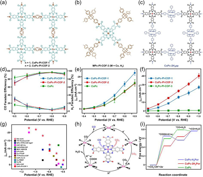 | Fig. 8. Schematic representation and electrocatalytic CO2RR performances of the four phthalocyanine-based PI-COFs. (a) 2D CoPc-PI-COF, Reproduced with permission [73]. Copyright 2021, American Chemical Society. (b) 3D CoPc-PI-COF-3. Reproduced with permission [51]. Copyright 2021, Wiley-VCH. (c) CoPc-2H2Por. Reproduced with permission [45]. Copyright 2022, Wiley-VCH. (d) Faradaic efficiency. (e) Partial CO current density. Reproduced with permission [73]. Copyright 2021, American Chemical Society. (f) Faradaic efficiency. (g) jCO of CoPc-PI-COF-3 in H-type electrochemical cell. Reproduced with permission [51]. Copyright 2021, Wiley-VCH. (h) Proposed mechanism and (i) free energy diagram for the CO2RR process of CoPc-2H2Por. Reproduced with permission [45]. Copyright 2022, Wiley-VCH. | |