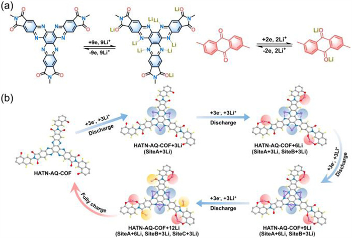 | Fig. 9. Possible lithium storage processes of HATN-AQ-COF. (a) The lithium binding sites of HATN-AQ-COF. (b) Possible lithium storage process of HATN-AQ-COF. Reproduced with permission [17]. Copyright 2022, Wiley-VCH. | |