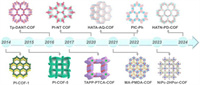 | Fig. 1. The development timeline of representative PI-COFs. Image for PI-COF-1: Reproduced with permission [11]. Copyright 2014, Springer Nature. Image for PI-COF-5: Reproduced with permission [12]. Copyright 2015, American Chemical Society. Image for Tp-DANT-COF: Reproduced with permission [13]. Copyright 2016, Royal Society of Chemistry. Image for TAAP-PTCA-COF: Reproduced with permission [14]. Copyright 2017, American Chemical Society. Image for PI-NT COF: Reproduced with permission [15]. Copyright 2020, American Chemical Society. Image for MA-PMDA-COF: Reproduced with permission [16]. Copyright 2021, American Chemical Society. Image for HATA-AQ-COF and PIC-pH: Reproduced with permission [17,18]. Copyright 2022, Wiley-VCH. Image for NiPc-2HPor COF: Reproduced with permission [19]. Copyright 2023, Oxford University Press. Image for HATN-PD-COF: Reproduced with permission [20]. Copyright 2024, Springer Nature. | |