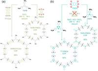 | Fig. 4. Schematic illustration for the syntheses of TAPB-based PI-COFs and PMDA-based PI-COFs under ionothermal conditions. (a) In ZnCl2. (b) In an eutectic salt mixture [39]. | |