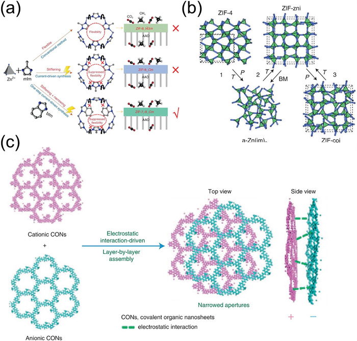 | Fig. 2. (a-c) Scale-up-friendly MOF, ZIF, COF membrane synthesis, respectively. Reproduced with permission [6]. Copyright 2022, Springer Nature. | |