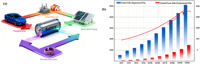 3.1. StatusSince their commercialization in the 1990s, lithium-ion batteries (LIBs) have been extensively deployed in transportation, photovoltaic energy storage, and wearable electronics owing to their high specific capacity, long cycle life, and low self-discharge rate (Fig. 4a) [26-28]. With the rapid growth of new energy industries, global LIB production is expected to reach 5127 GWh by 2030, generating over 1546 GWh of spent LIBs (Fig. 4b). These end-of-life LIBs contain not only corrosive and toxic substances that pose environmental risk but also critical metals (Li, Ni), making the recycling both an ecological necessity and an economic opportunity [29].